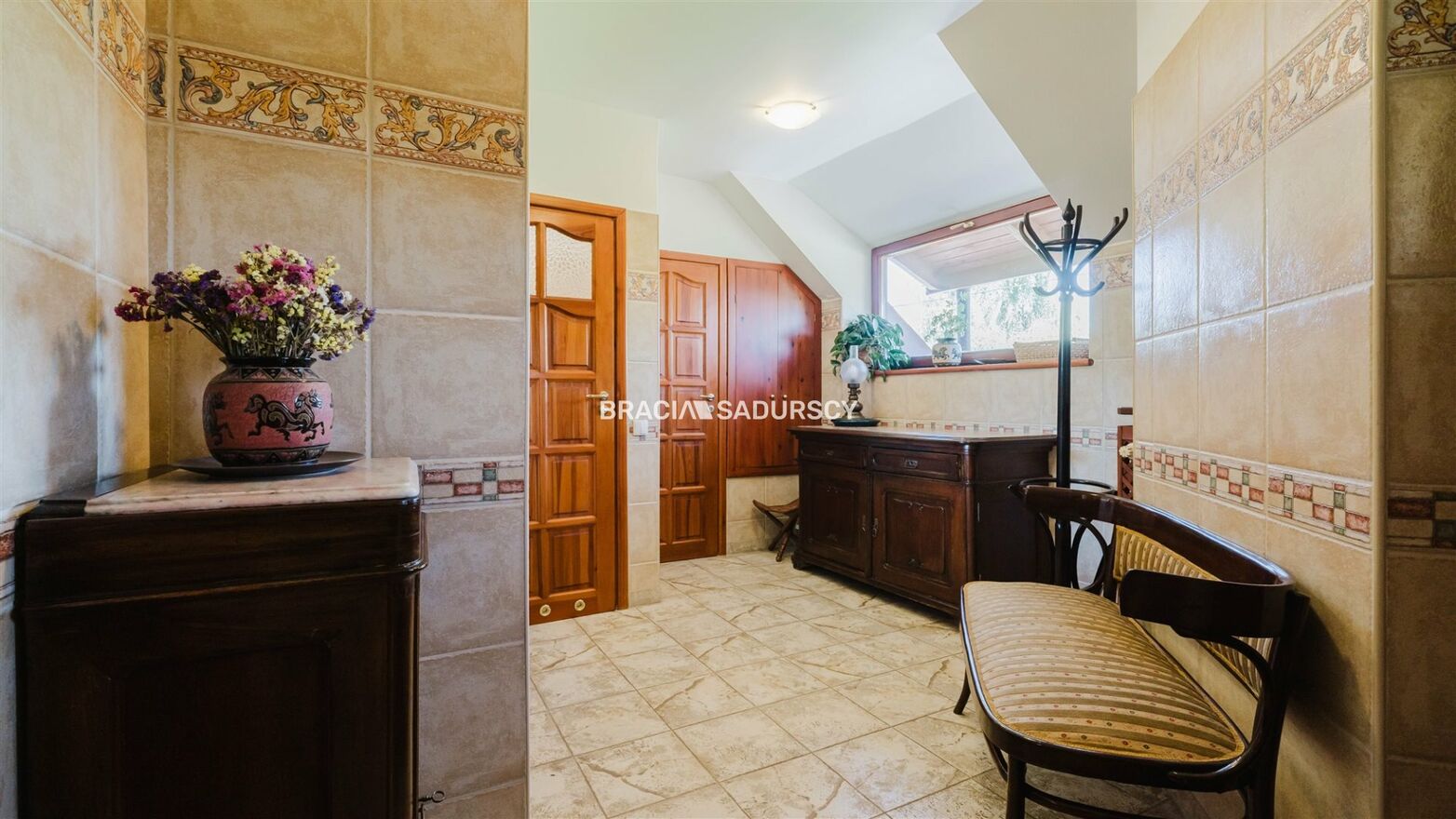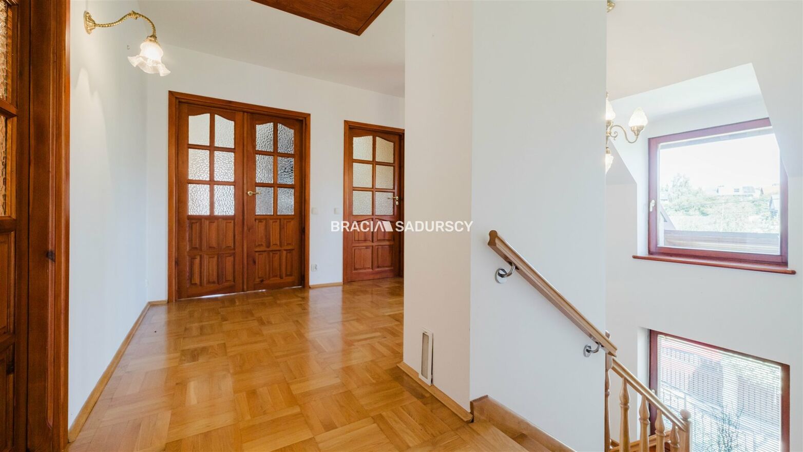 Stolarka okienna - drewniane okna trzyszybowe Termglass, okna połaciowe Fakro. Stolarka drzwiowa w oferowanej nieruchomości to drewno naturalne. Ściany zewnętrzne wykończone tynkiem cementowo-wapiennym z mrozoodpornymi cokolikami. Posadzki wewnątrz wykonane z glazury oraz drewnianych podłóg na legarach. Parkiet oraz schody z drewna dębowego.