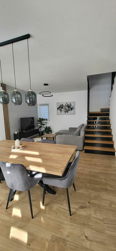 Dom został wykończony w nowoczesnym stylu z wykorzystaniem wysokiej jakości materiałów oraz rozwiązań zwiększających komfort użytkowania.